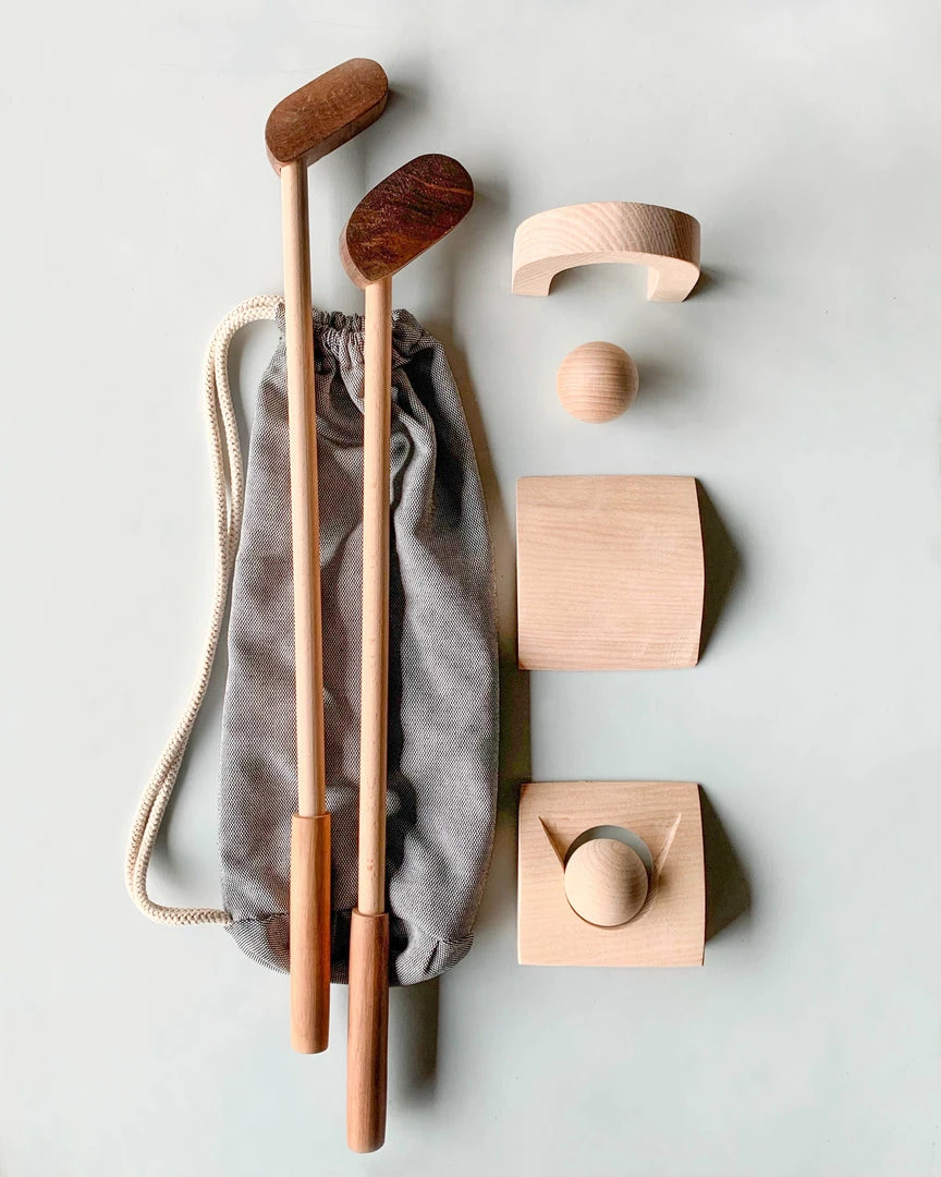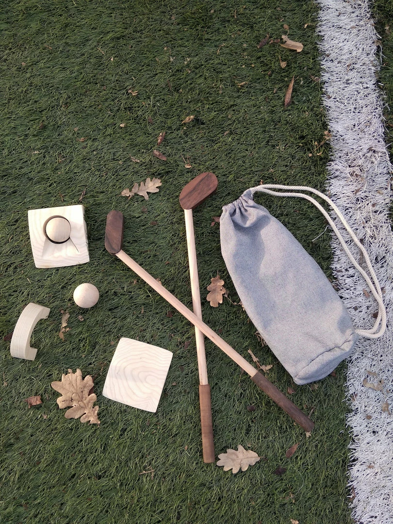 A fun wooden toy that includes 2 clubs, 2 balls, 1 hole plate, a slope and a gate. All crafted from wood for natural, long-lasting durability. Made from black walnut, ash wood and beech wood.