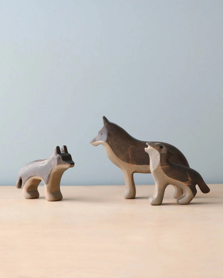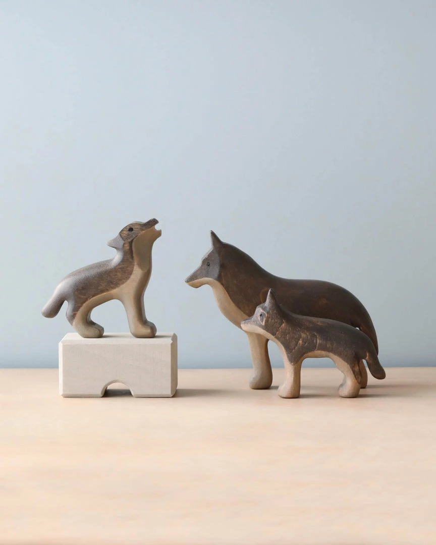 Handmade from alder wood and coated with organic linseed oil and painted with non-toxic, water based paint. This set includes a mama wolf and two babies.