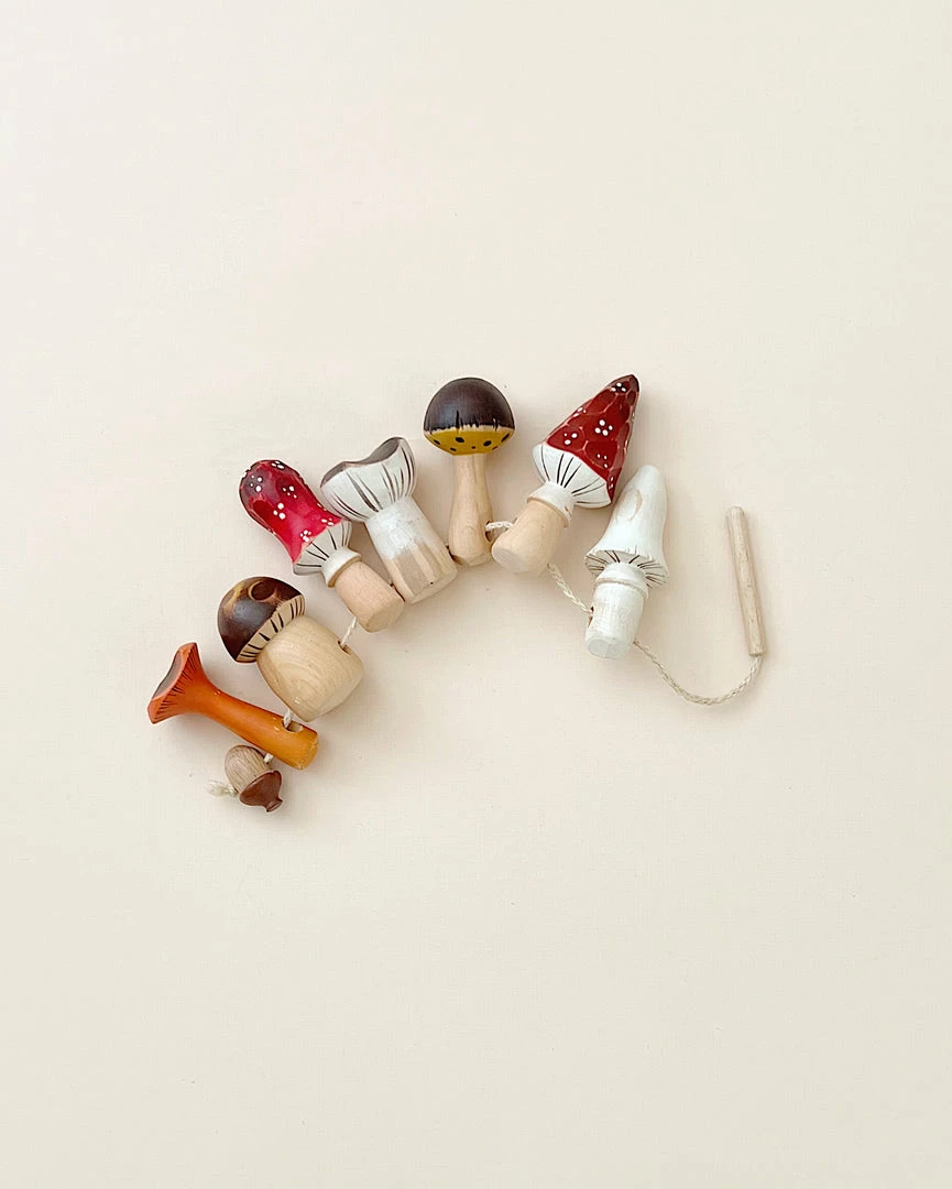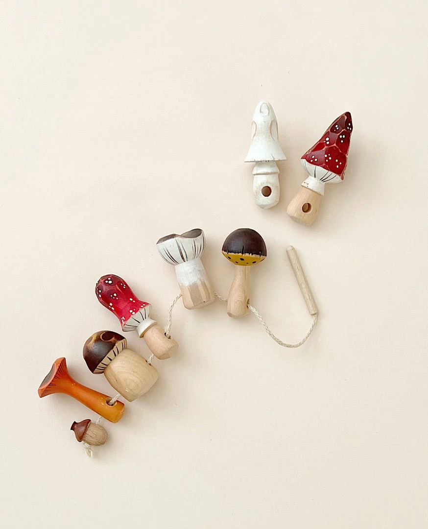 This set includes 7 handmade mushrooms and a little acorn. Little ones can use the included lace and wooden needle to lace all the mushrooms together.