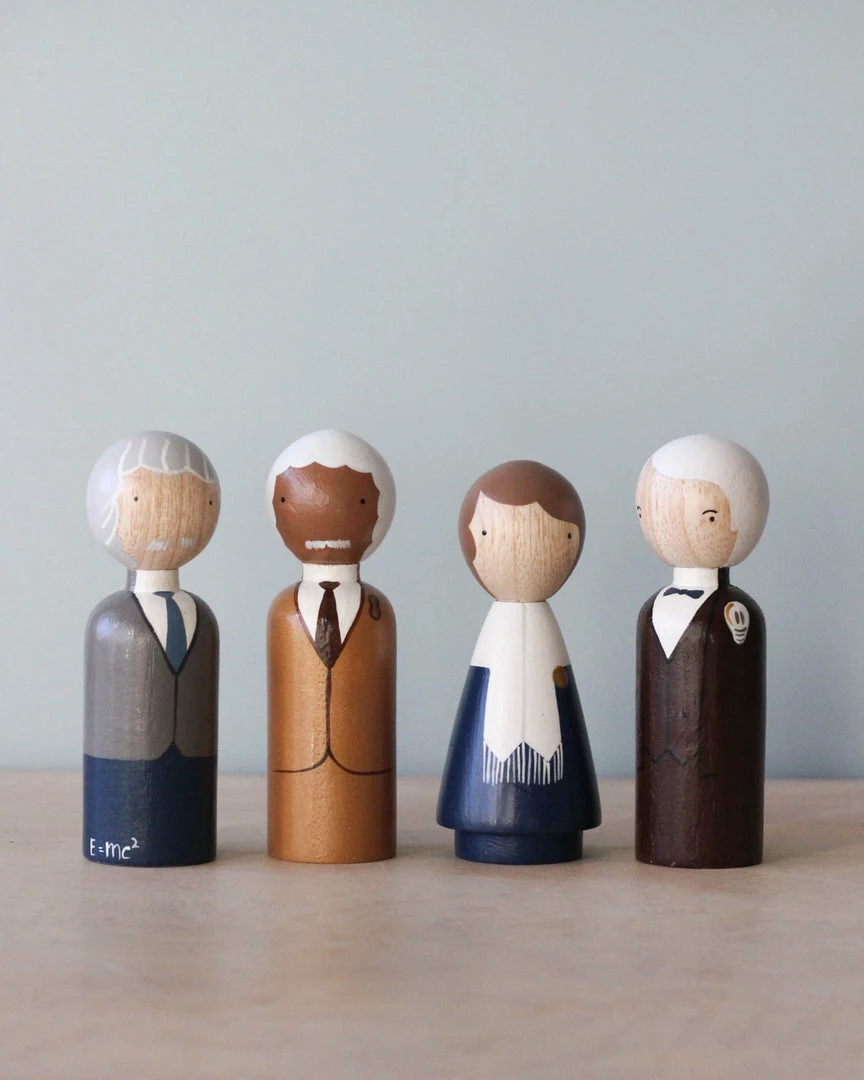 The Scientists doll set includes four 3.5″ dolls. George Washington Carver, Marie Curie, Albert Einstein, and Thomas Edison.