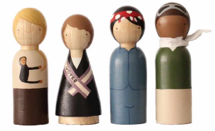 The Trailblazers doll set includes four 3.5″ dolls. Jane Goodall, Suffragette, Rosie the Riveter and Bessie Coleman.Â