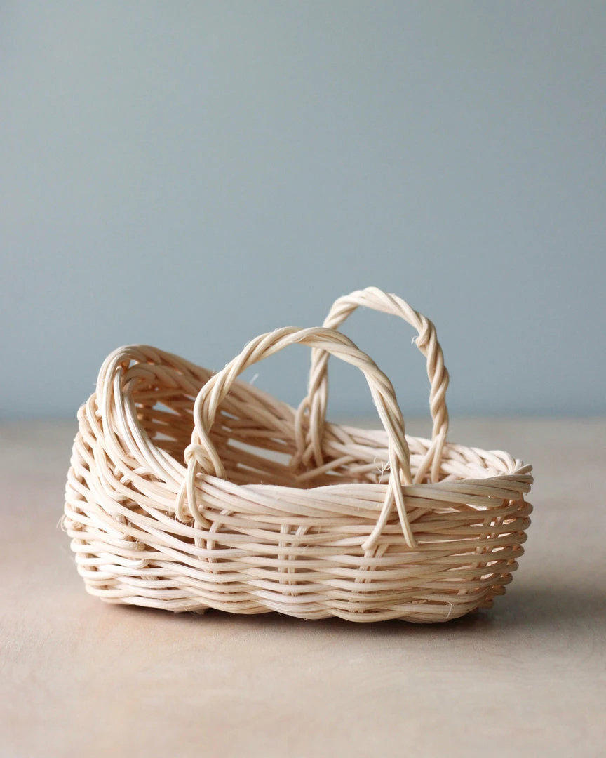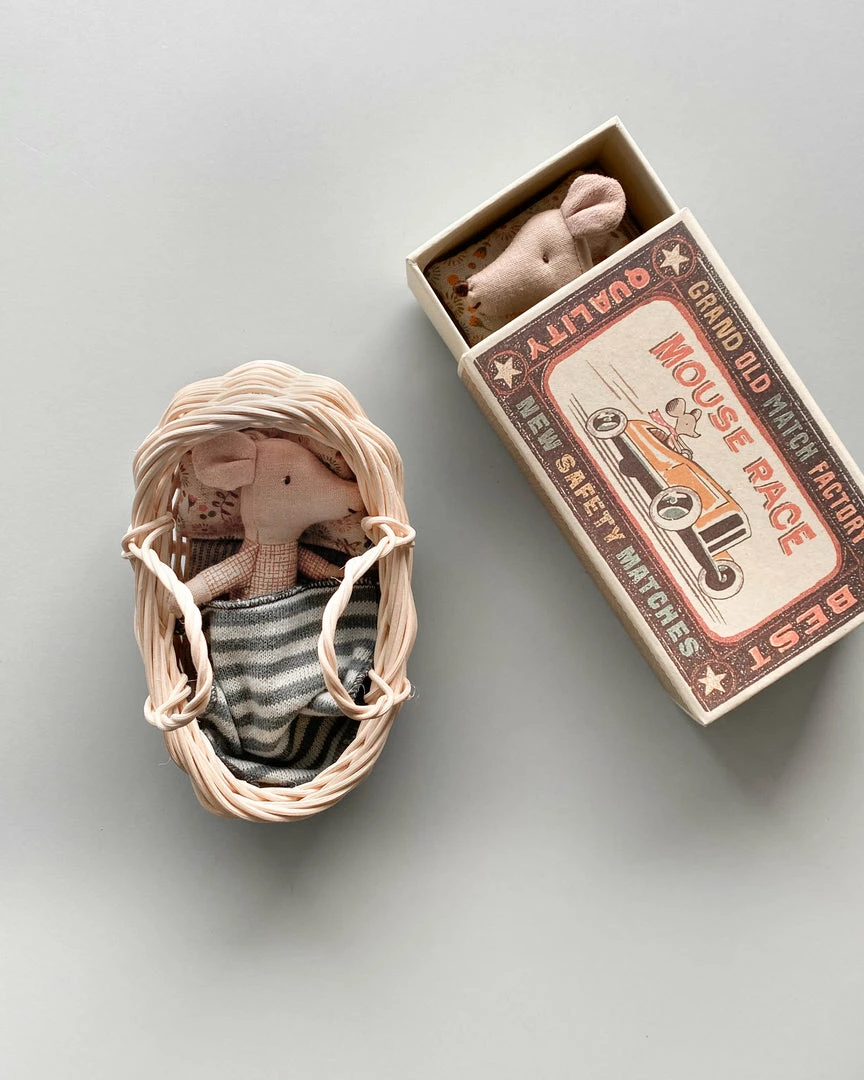 Designed to fit Maileg mice, the handmade rattan cot measures 4.7″ long and 5″ wide.Â