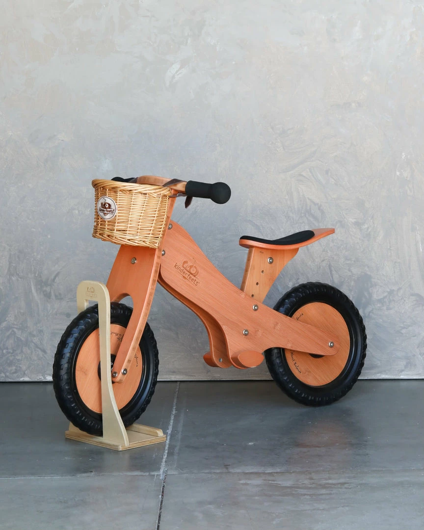 Help little ones understand the importance of keeping their belongings in a safe space with the kinderfeets bike stand. Instead of laying the bike on its side or leaning it against a wall, use this simple and functional bike rack to store it! By doing so, children learn to maintain the quality of their belongings and also develop organizational skills.