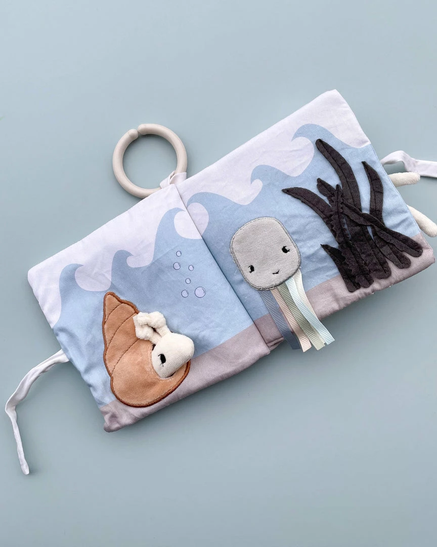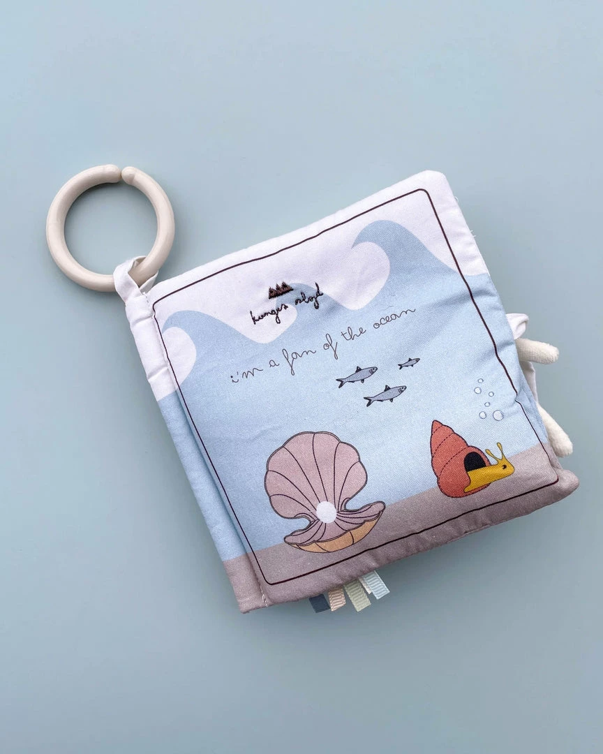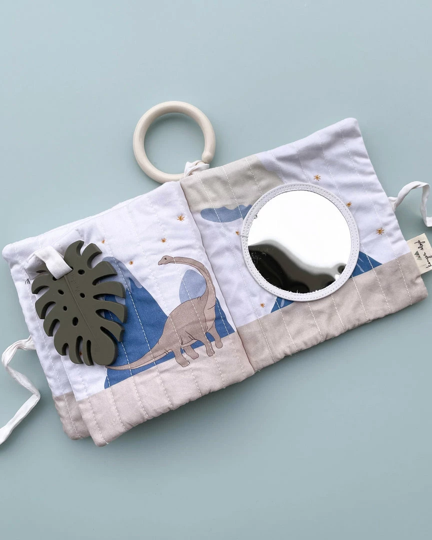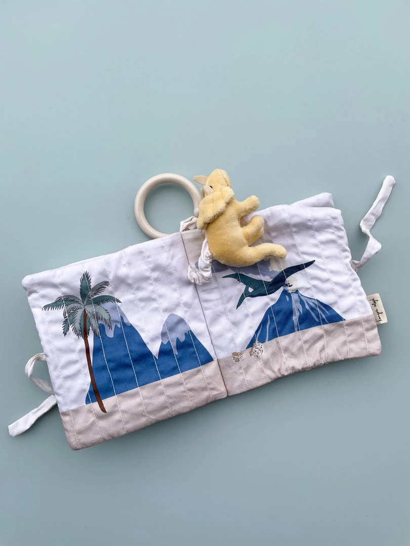 This cute fabric book can be attached to a stroller or used independently as an activity toy for your baby. Inside the fabric book your little one will discover lots of interesting finds.
