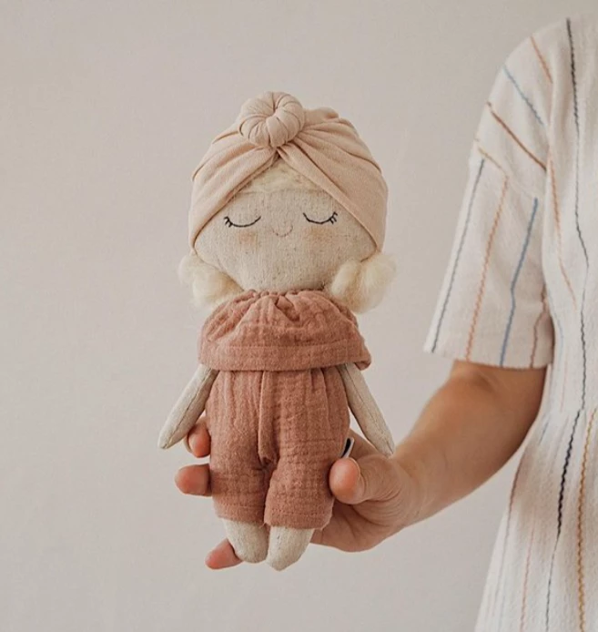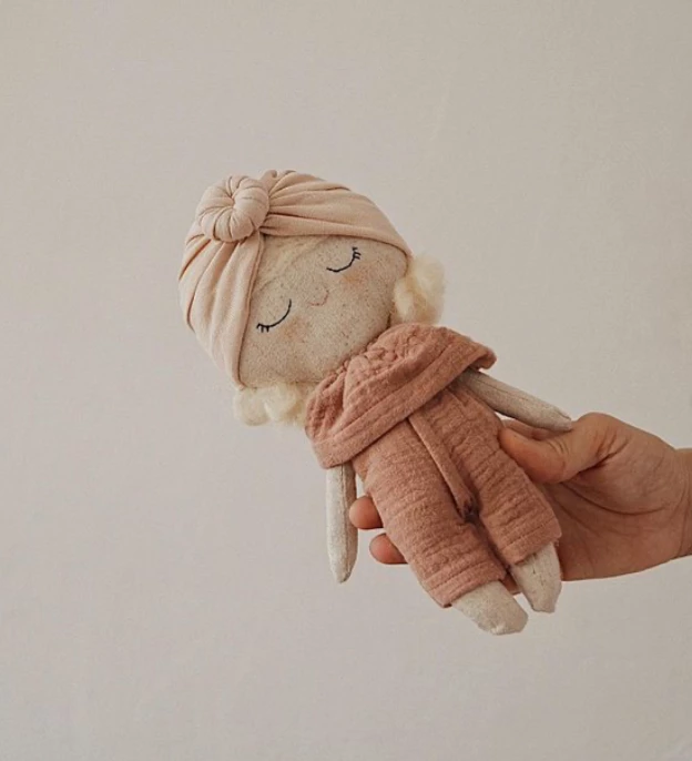 Handmade in Spain by Lelelerele with cotton canvas, linen dress and turban. Her hair is made of felt wool and her face is embroidered by hand.