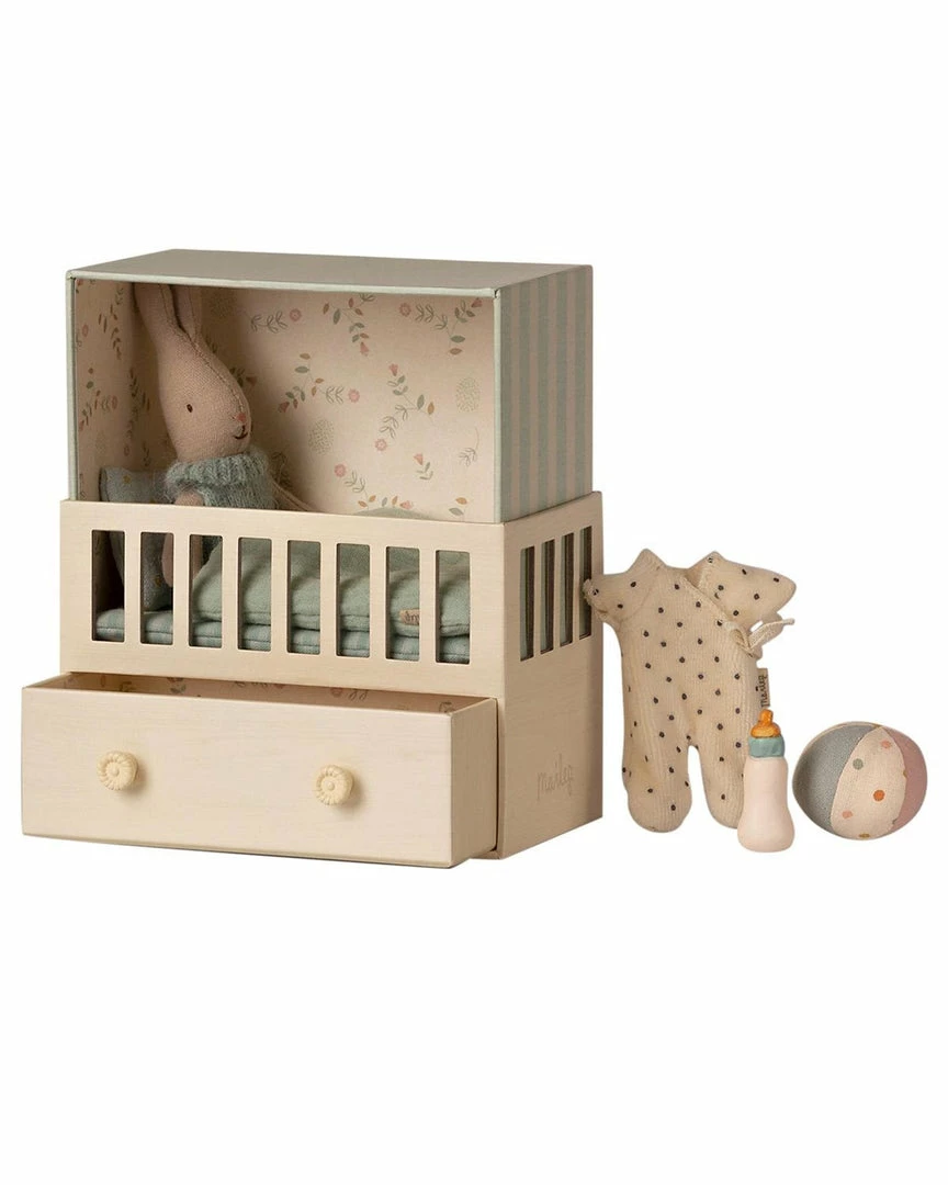 This sweet playful set contains a micro bunny, baby room box, baby suit, ball and a baby bottle. Everything you need for the perfect play and story telling about a baby. Add your favorite baby accessories to extent the story.