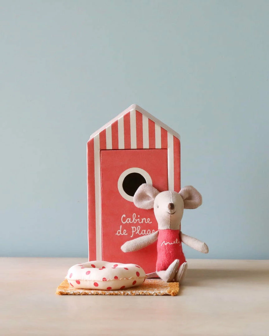 Vacation time. These mice are ready for a day at the beach, with all needed accessories and a beautiful striped beach house.