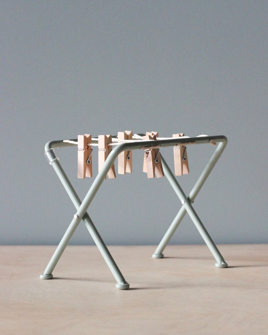 Our new, smaller clothes drying rack is sized right for our micro friends and a perfect fit for the dollhouse. Includes 6 pegs and is painted light aqua.