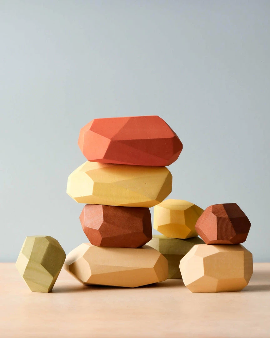 These Balancing Stones are a renewed take on the classic wooden building block, inspired by the ancient Japanese game Tumi-Ishi. The multi faceted rocks allow for endless ways of stacking. Balancing stones assist in developing hand-eye coordination, fine motor skills, observation, logic, and inspire creativity. They are the perfect Montessori toy for children’s playrooms, nurseries, and as home decor. Each set contains 9 wooden stones.