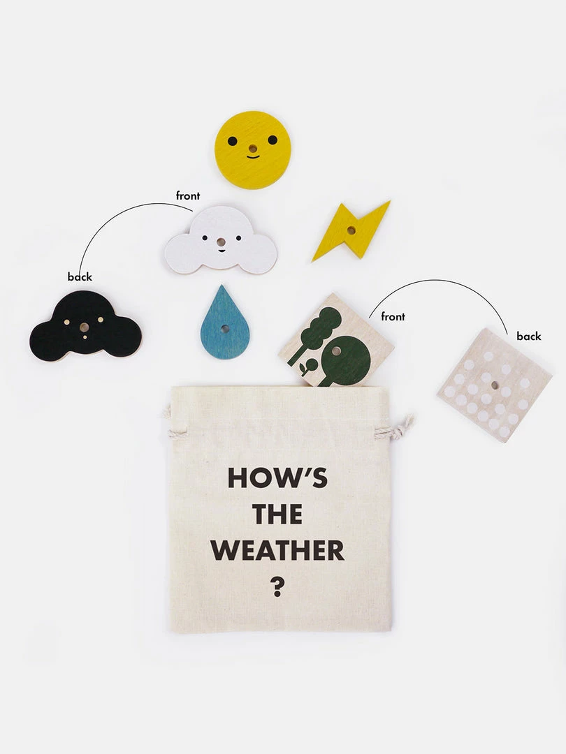 Includes: 1 base, 4 movable dials & slider, 5 weather pieces, cotton storage bag and introduction card.