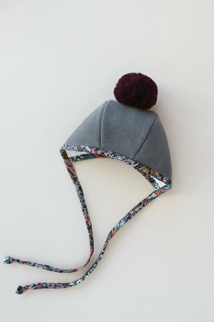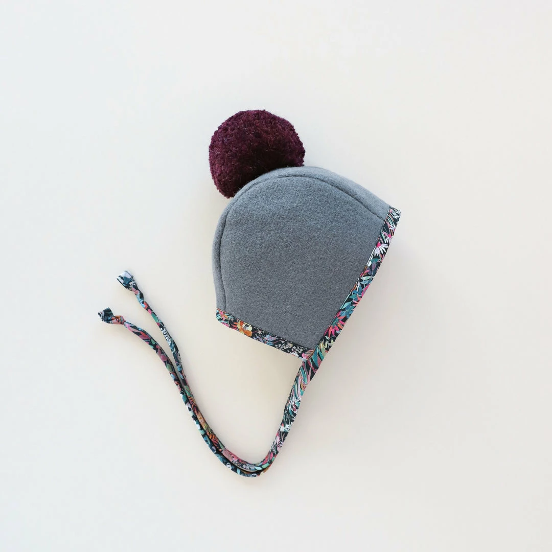 A gorgeous grey wool trimmed in high-quality Liberty of London floral print, and topped with a deep plum pom pom. This bonnet was proudly designed and handmade in the USA.