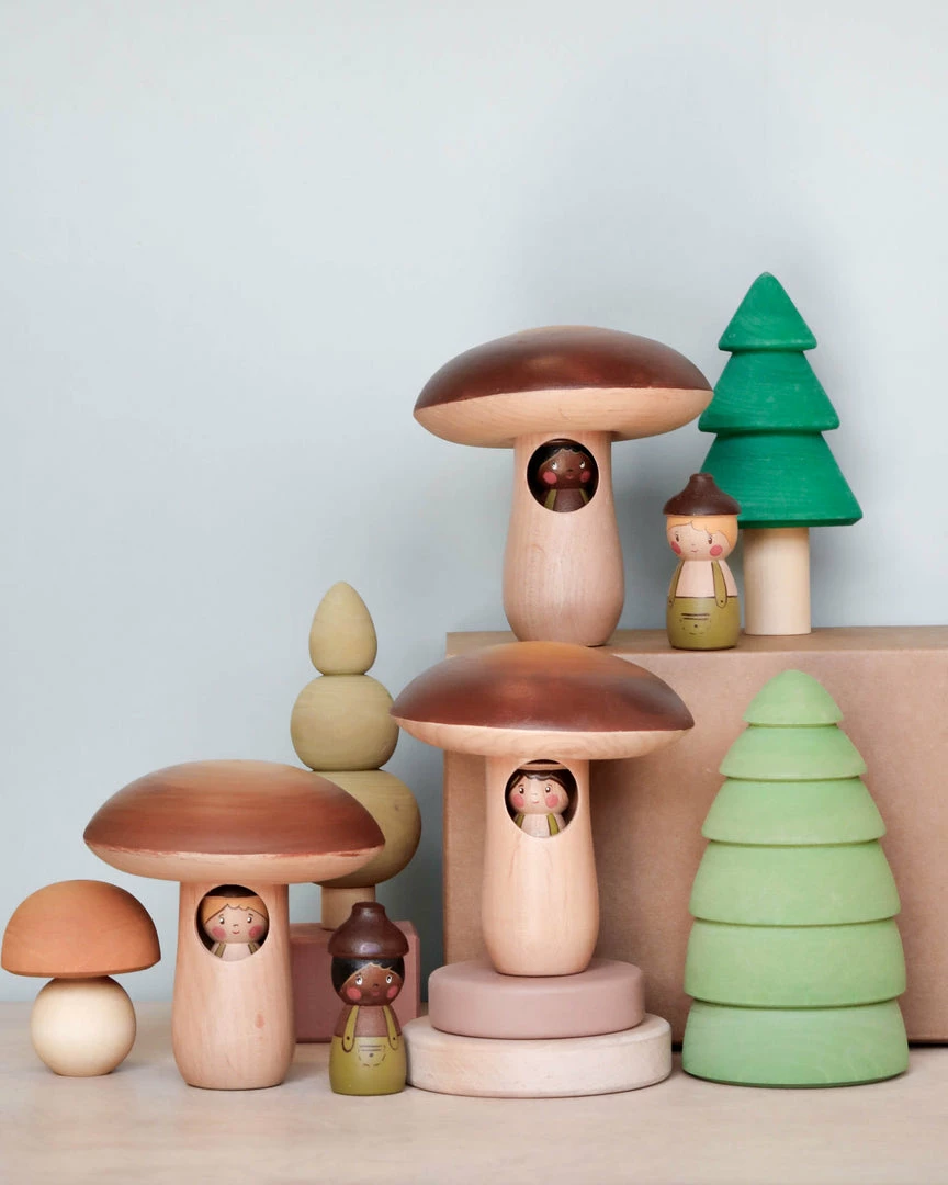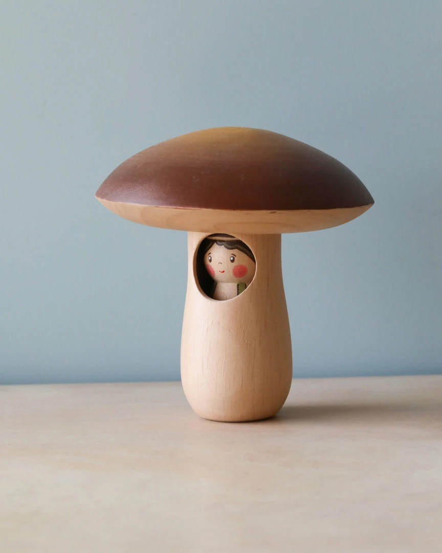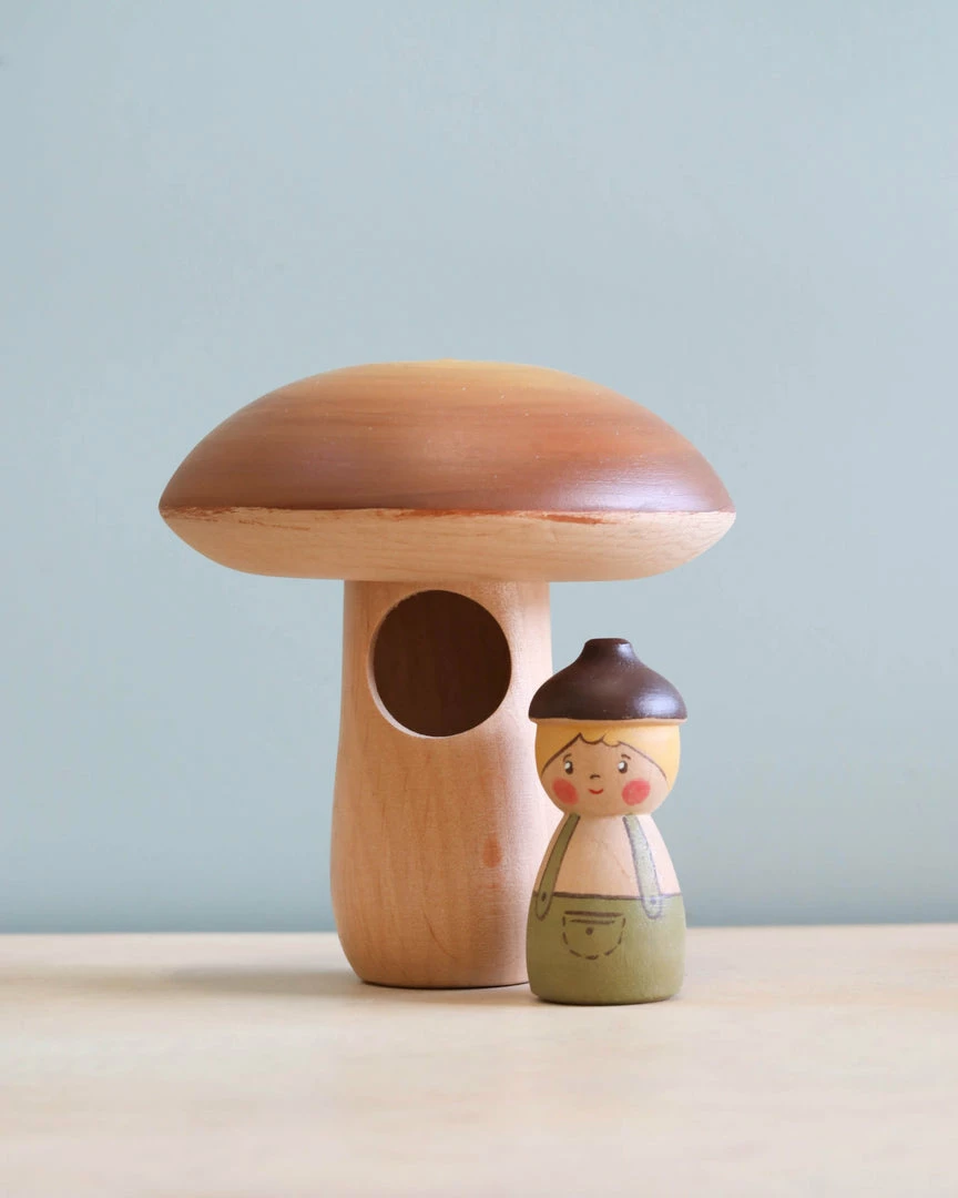 Handmade in Russia and painted with non-toxic paint, this mushroom house has a removable top. Inside, you will find a wooden doll with an acorn hat.