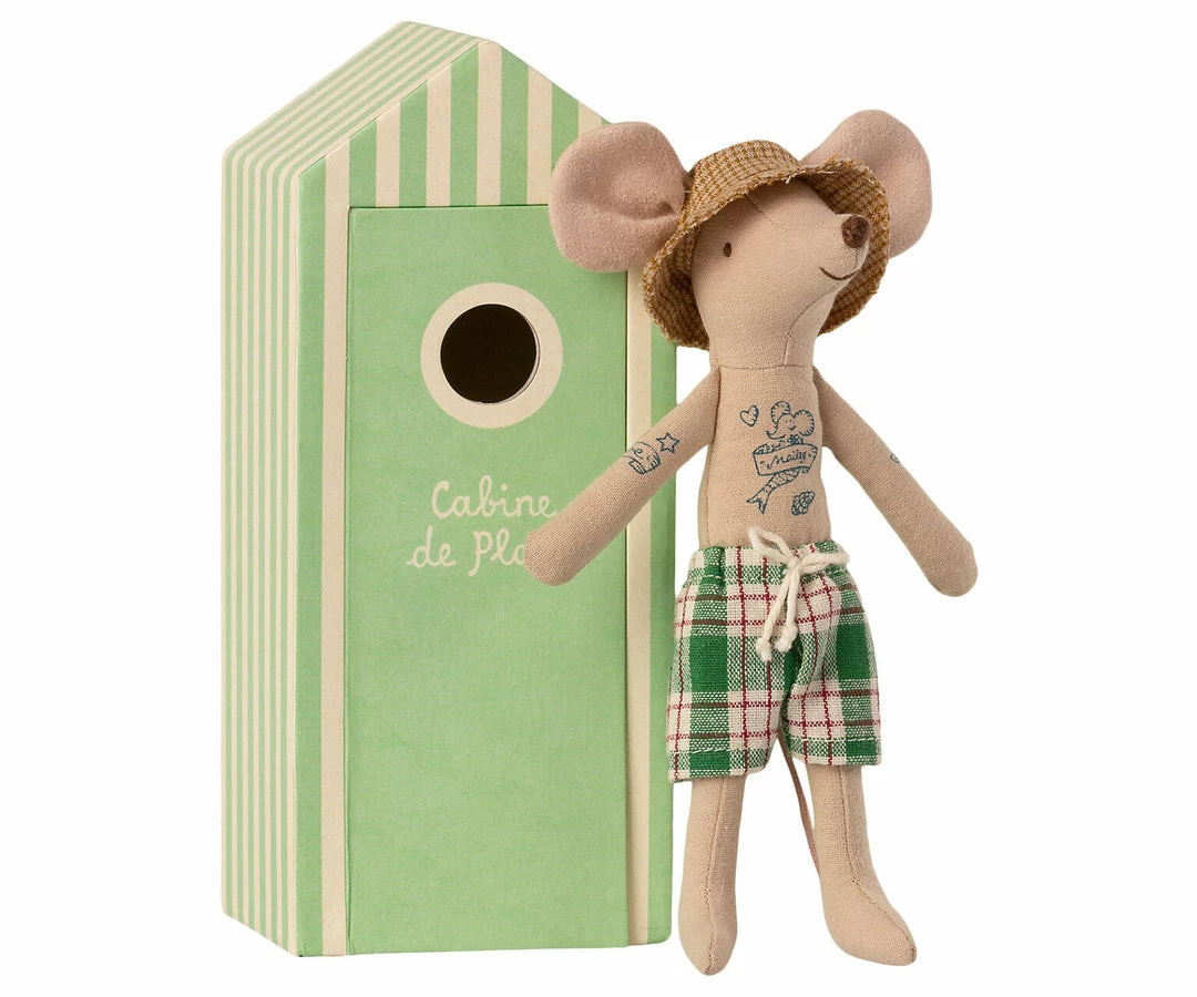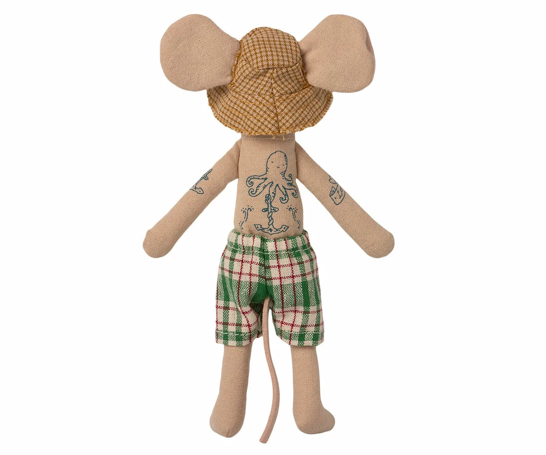 Vacation time! Dad mouse is ready for a day at the beach, with his sun hat, swim trunks, and a beautiful striped beach house.