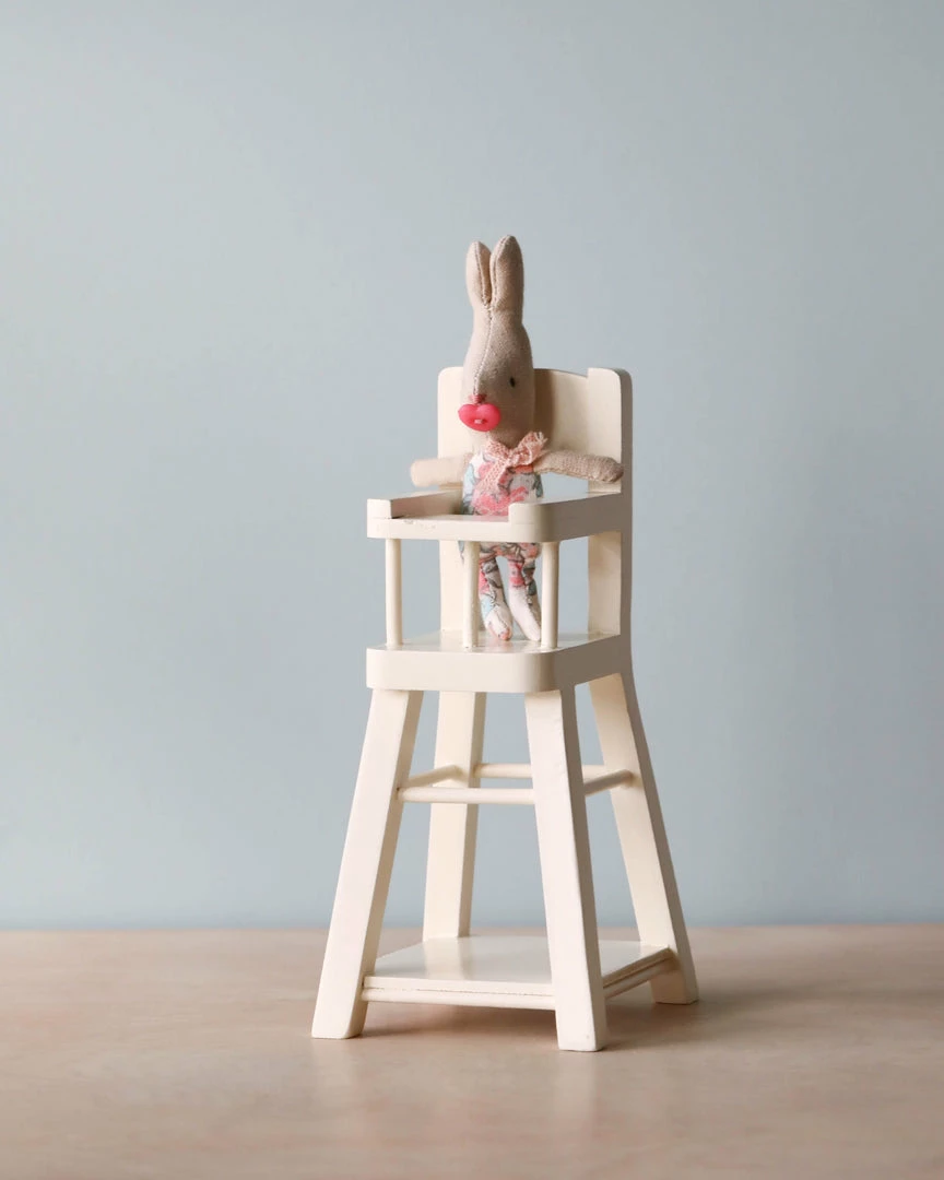 Mealtime is more fun with your Micro-sized Maileg friends. This wooden High Chair is designed to fit all micro bunnies and rabbits, as well as Big and Little Sister and Brother Mice.