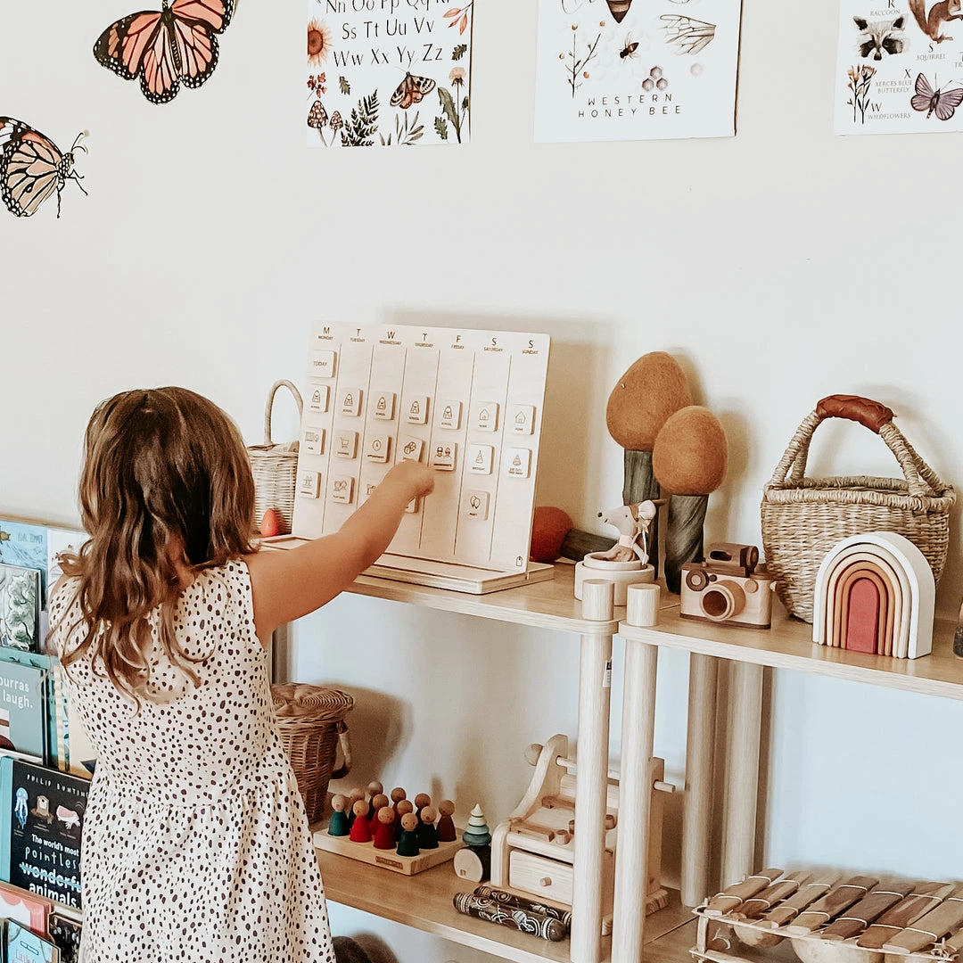 Starter set includes: 1 wooden backing board, 1 wooden base, 4 wooden shift tiles (today, morning, afternoon & evening) and the following tiles: School (side A), Kindergarten/Preschool (side B), Grandparents (side A), Grandparent (side B), swimming, play date, shopping, home, sports, party, birthday, appointment, library, park, eat out/ takeaway & beach.