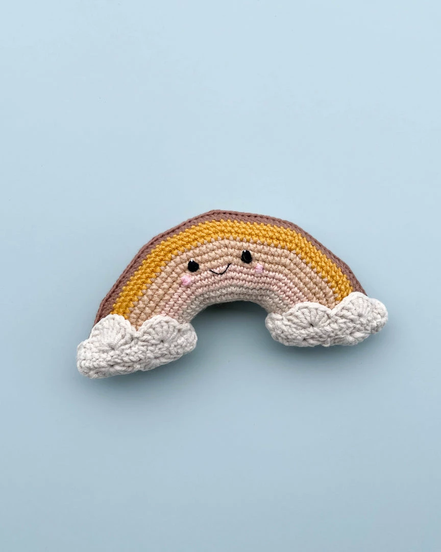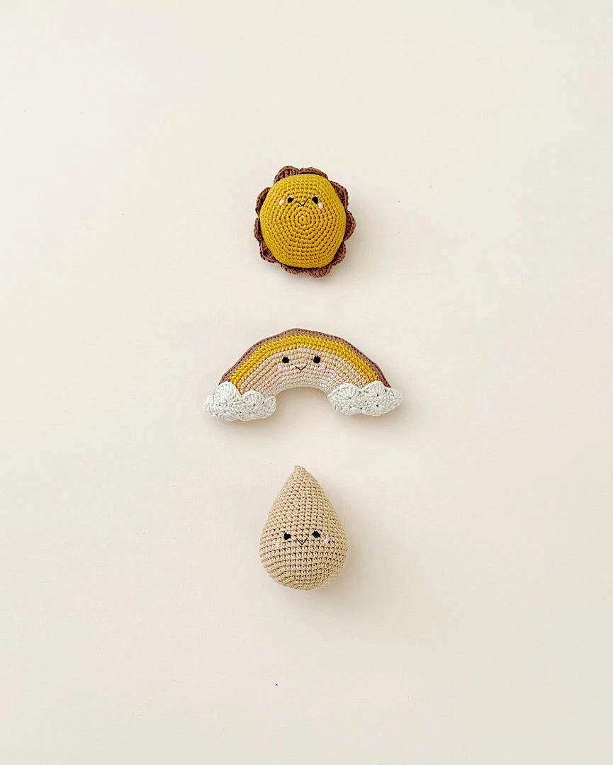 This set includes a sun rattle, rain drop rattle and a rainbow rattle.