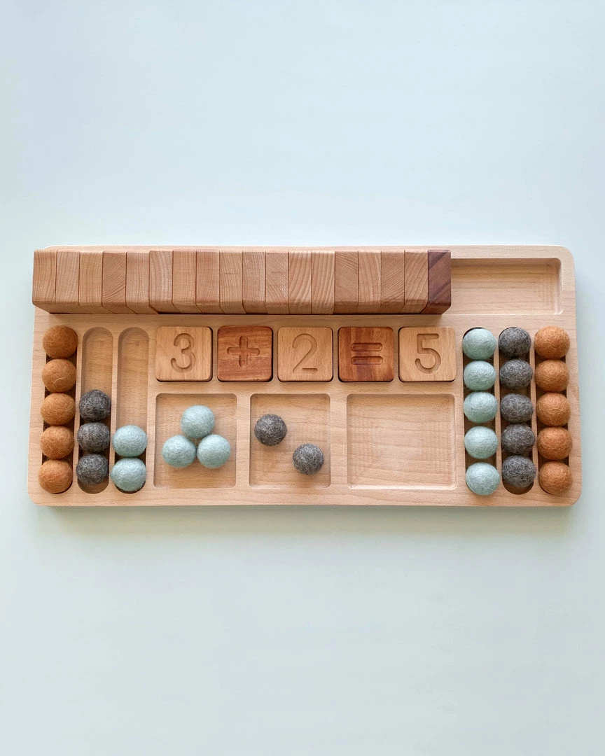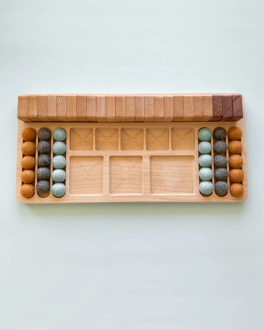Made from beech and mahogany wood and coated with food grade mineral oil, this is an extension of our original math board. Each set includes the number 1 through 20, plus/minus/equal signs, designated slot for storing the numbers and 6 rows of felt balls (30). If you would like to receive specific felt ball colors, please don’t hesitate to let us know.Â