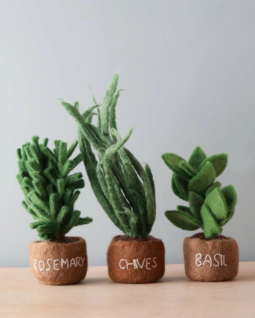 Perfect for adding some greenery to the pretend kitchen, or perhaps a gift for a little cooking enthusiast. These adorable felted herbs will last a lifetime, unlike the real deal! We’re not sure if they taste as good, but they are made from entirely natural and sustainable materials. We wouldn’t reccommend using them in your next recipe, however. Choose from Basil, Mint, Chives or Rosemary – depending on your tastebuds!