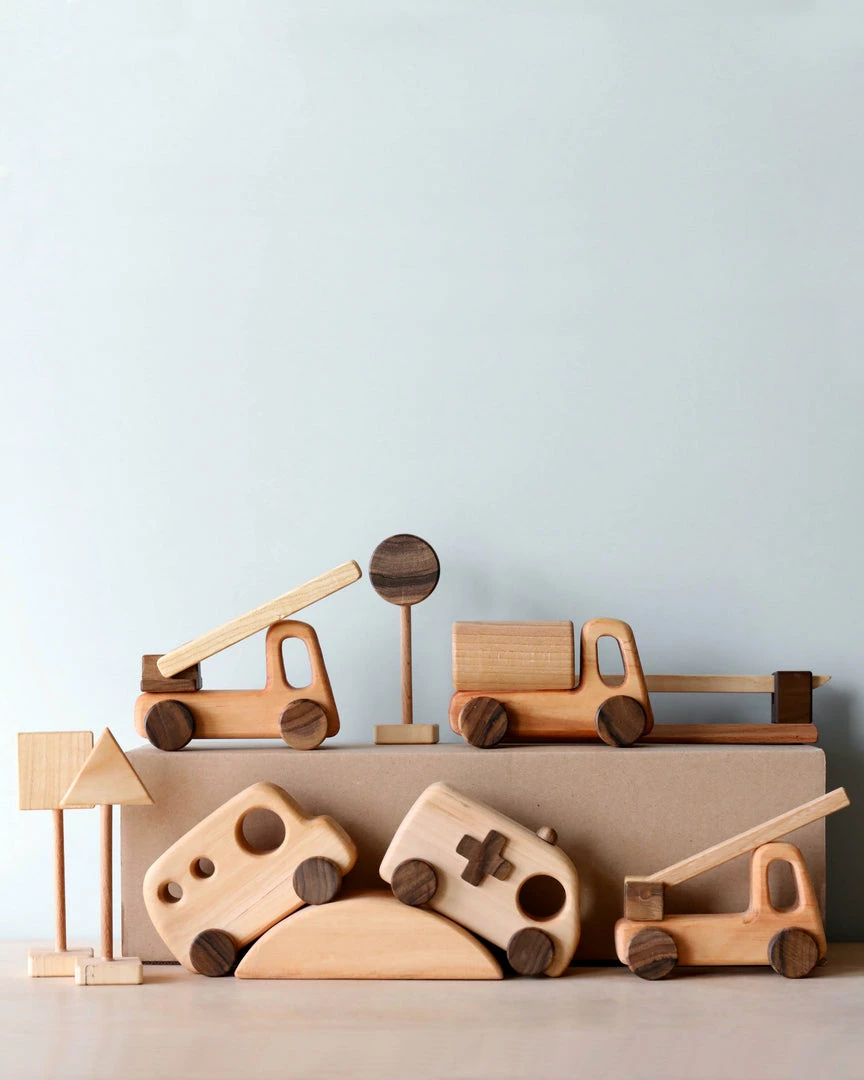 Handmade in Ukraine from beech wood, this set includes six vehicles, 3 road signs, a bridge and a gate.