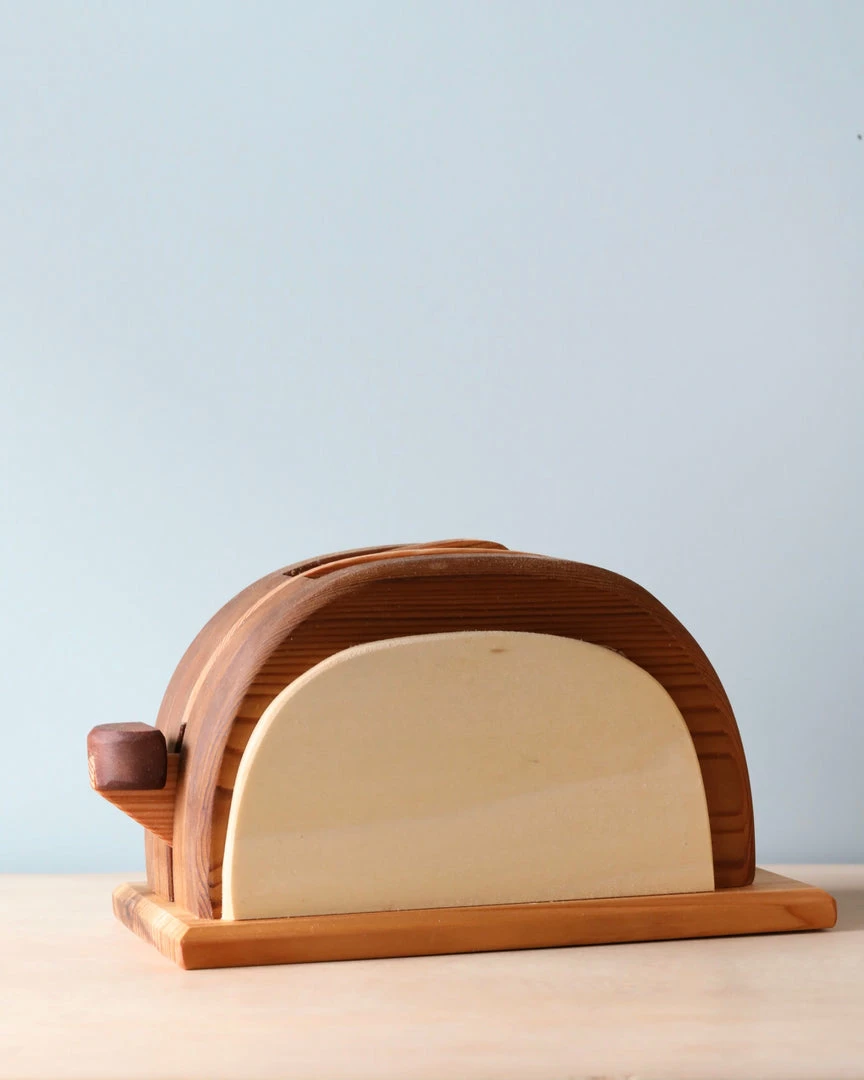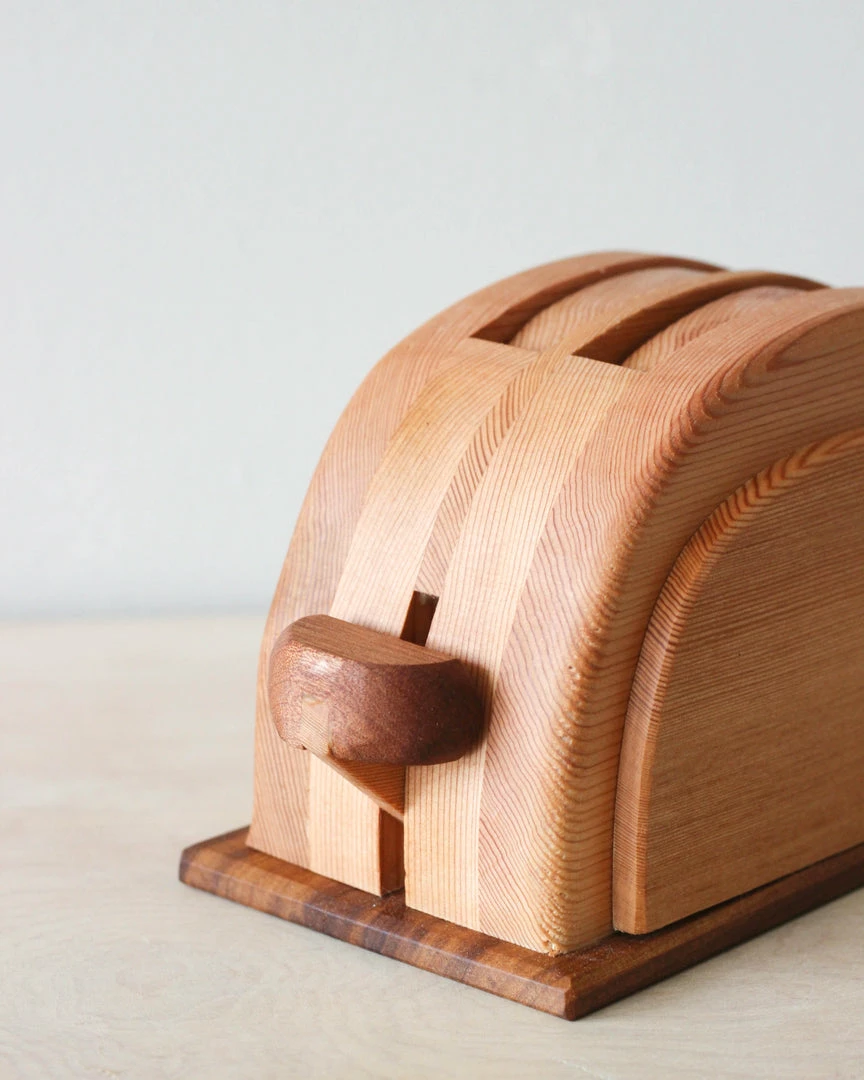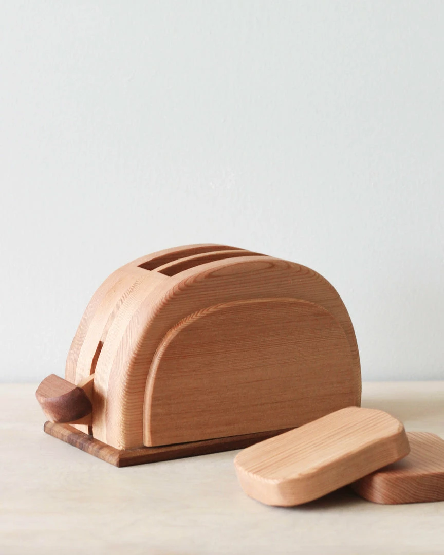 Handmade in USA, from cedar wood, each set includes a toaster and two slices of bread. The bread slices pop out when the lever is pushed down.