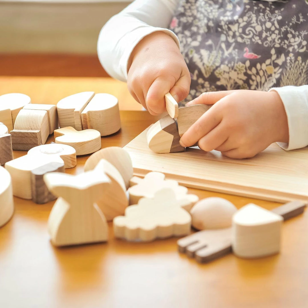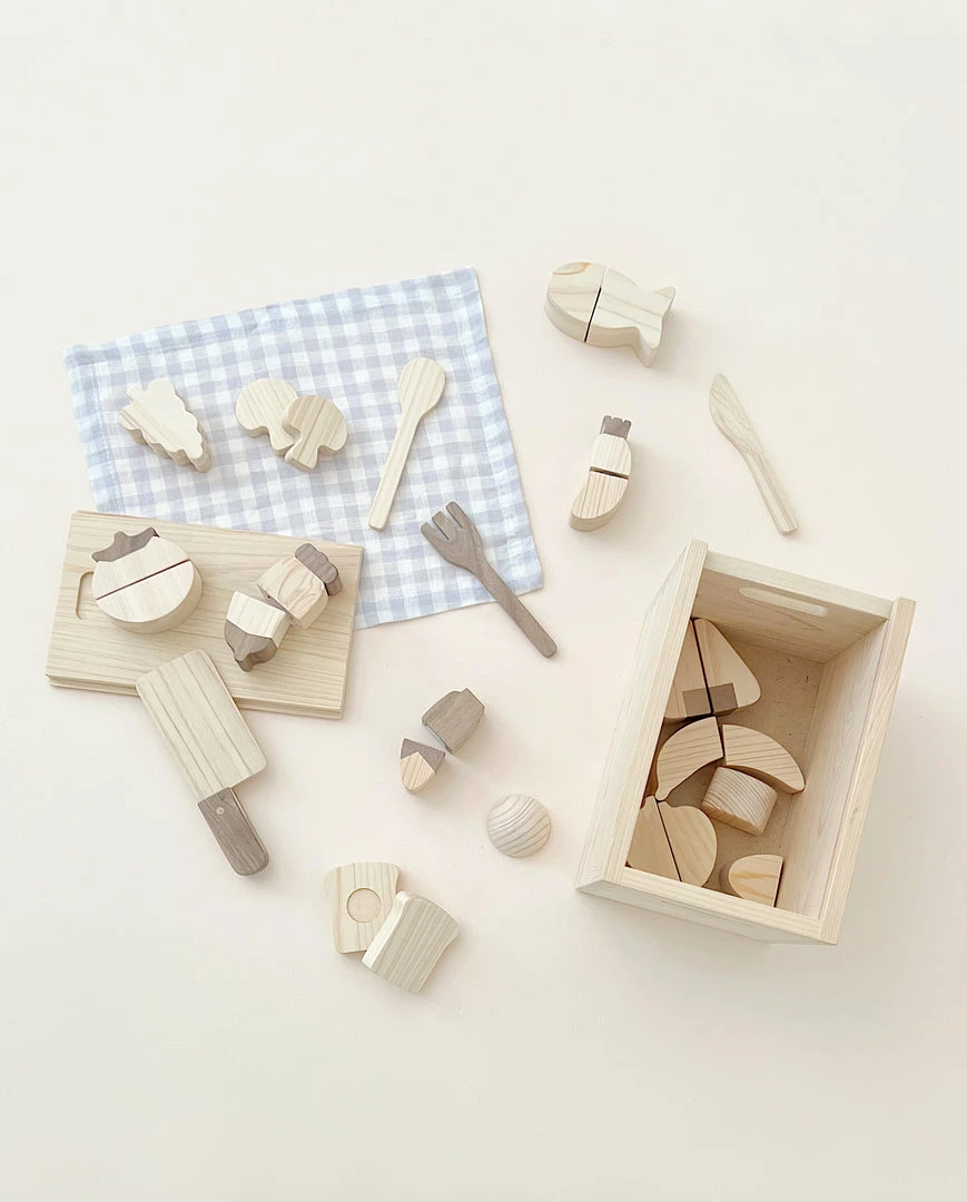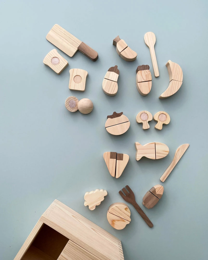 This set contains a mini wooden knife, spoon, fork and 13 different vegetables/food items. Everything stores neatly in the wooden box. The removable lid of the box can be used as a cutting board.