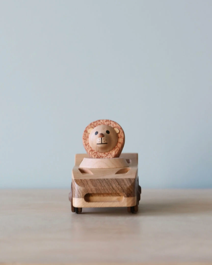 Made of solid wood with a pull back feature. The animal is not removable. Available in three different designs.Â