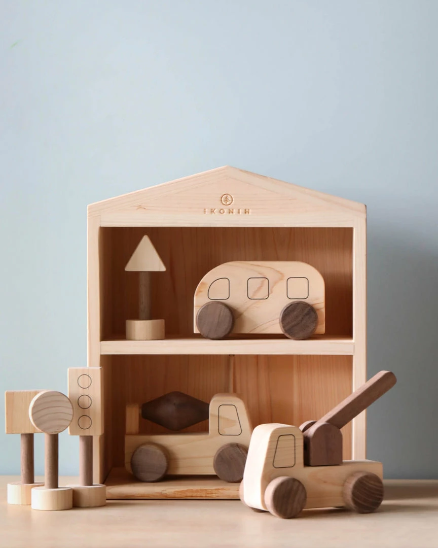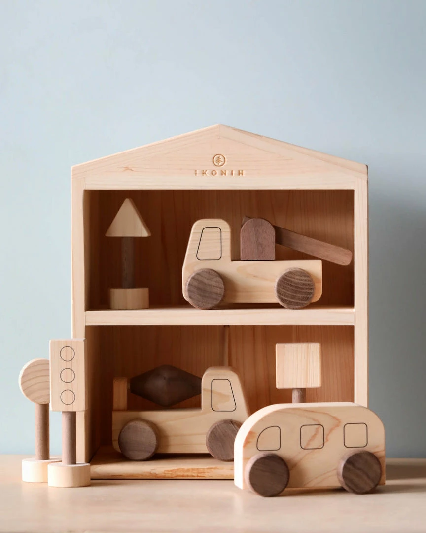 This parking garage includes three vehicles and four road signs and the parking tower. When you pull the string located behind the tower, the floor board raises and the parked cars roll out.
