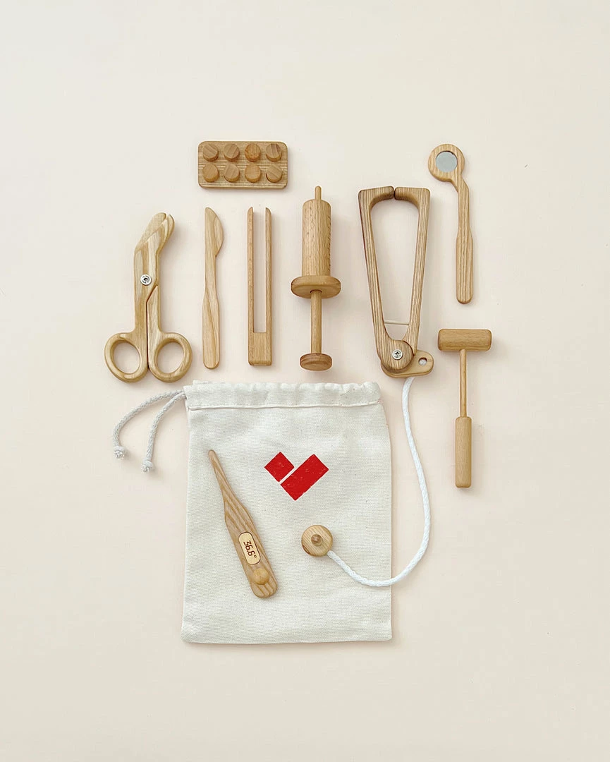 Handmade in Russia, this 10 piece medical kit is the perfect imaginative play toy for future doctors and nurses.