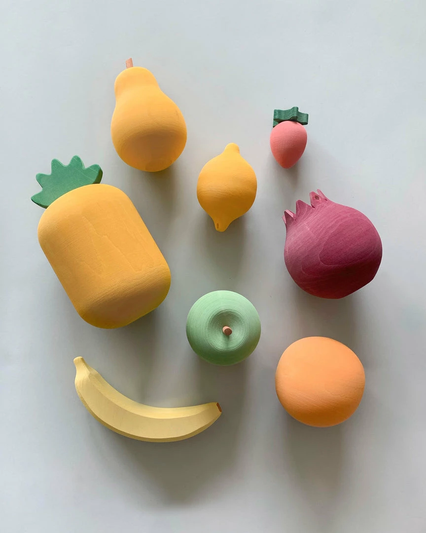 Handmade from linden wood, these vibrant fruits make the perfect addition to any play kitchen. Each set includes 8 fruits and they arrive in a drawstring bag.