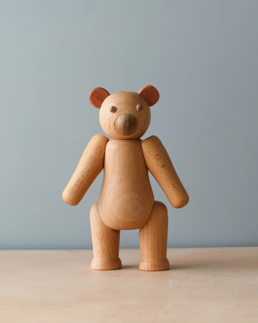 With flexible joints, this wooden bear can also easily move its head, arms, and legs. Combining this with a carefully balanced design, the bear, whether it be sitting or standing, can fully support itself in many positions.