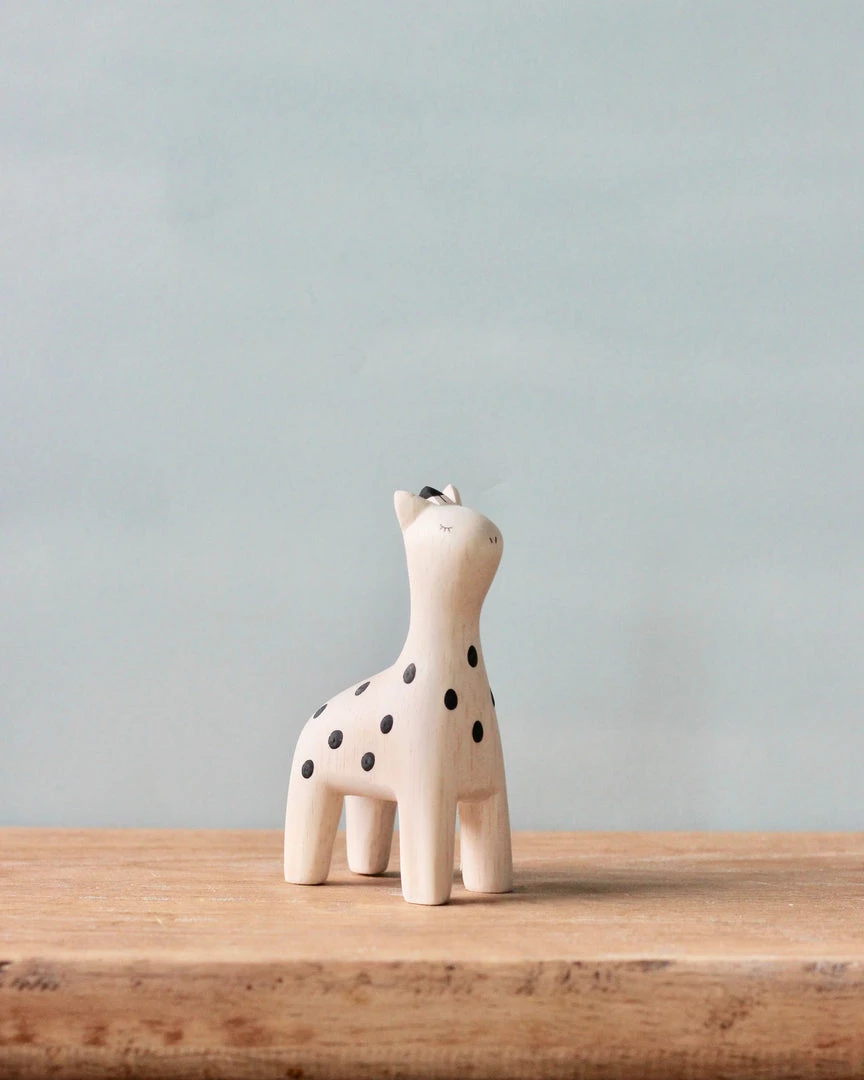 Each animal is hand carved from a soft light wood and then hand-painted with the sweetest expressions and patterns. Due to their handcrafted nature, each animal is slightly different.