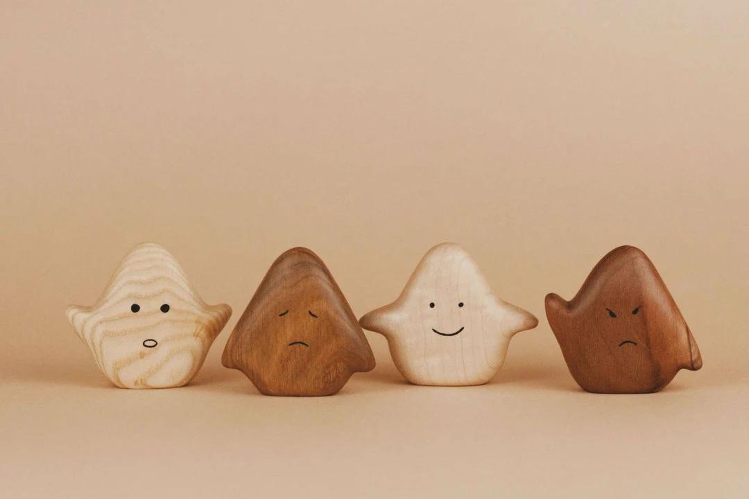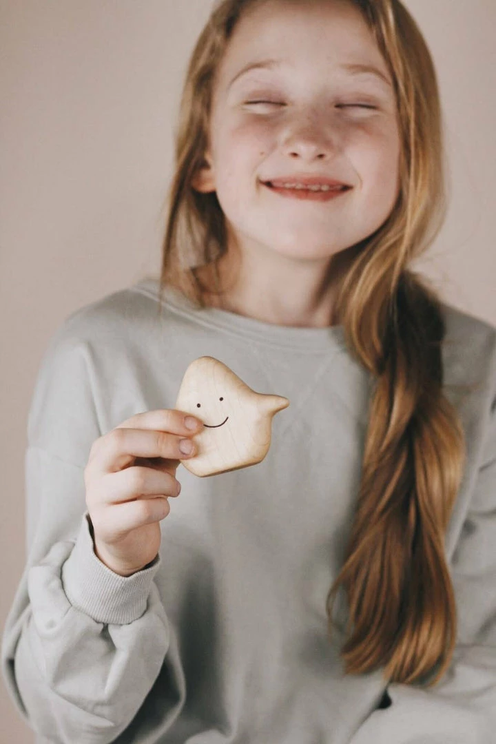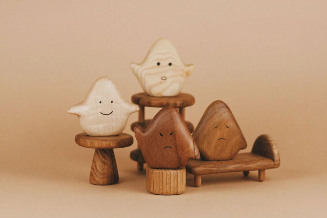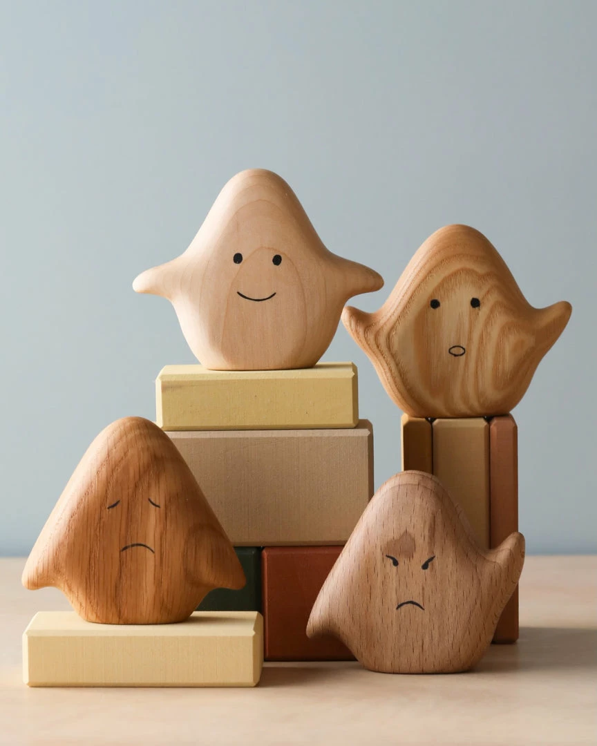 Four wooden ghost figures to teach little ones about basic emotions. Each pieces is carefully sanded to be ultra smooth and coated with natural linseed oil. This set come in a cotton bag.