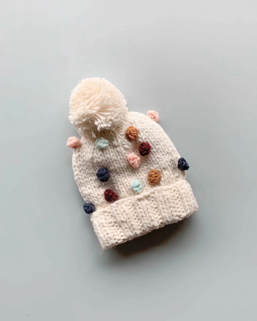 Gorgeous cream color base with accenting rich, fall color pom-poms.