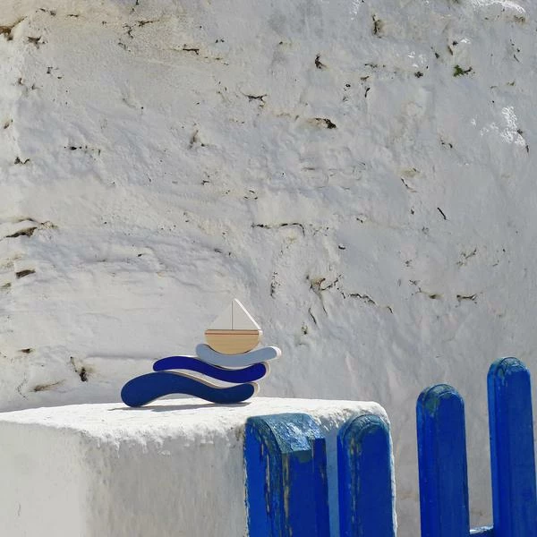 It is comprised of 5 pieces that the child can put in different ways to create different patterns of the sea and the boat. The convex form of the little boat permits slight swinging once placed on the waves.