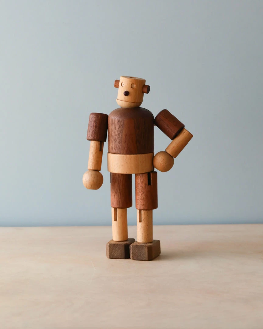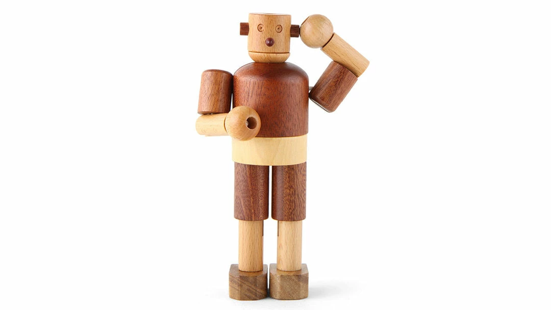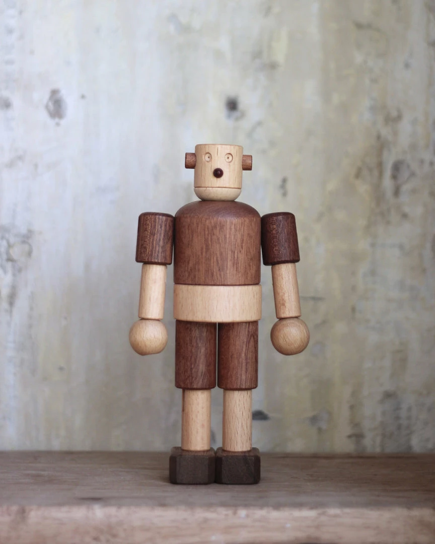 With its friendly and neat design, this unique wooden robot will no doubt be a intriguing part of your child’s play. The robot is crafted with different types of solid high-quality wood, as reflected in their distinctive natural colors and wood grain. All the pieces are strung together with highly durable elastic bands that provide the robot’s joints with free, 360-degree movement. This allows the robot to be positioned and played in a limitless amount of ways! Well made and well designed, it will withstand generations of play.