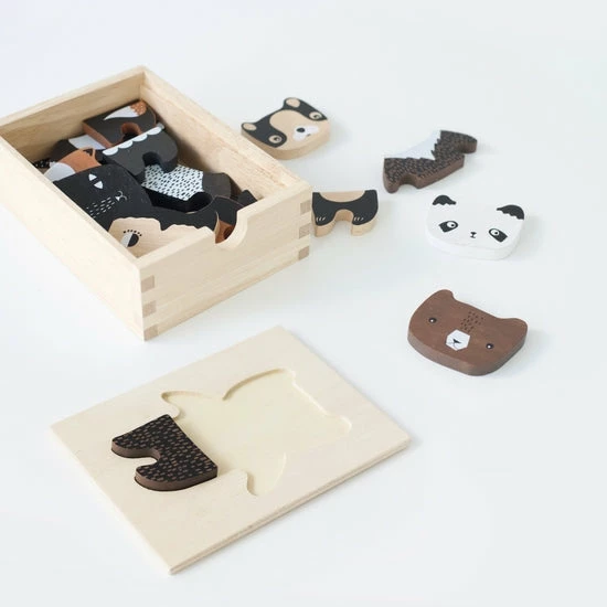 Mix + Match Animal Tiles are a classic toy reimagined in a unique style that is sure to inspire smiles. Six adorable animal characters can be combined any way for a seemingly unlimited creative play experience. The set contains 18 solid wood pieces with child-safe finishes and a natural wooden box for storage. Great for travel, or playtime at home, kids can develop motor skills and problem skills while designing their own combinations.