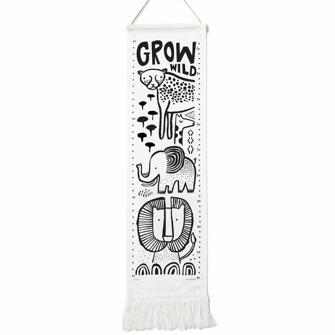 This growth chart features sweet animal faces that smile as your little one grows. Ethically and sustainably made in India using screen printing on organic cotton canvas, finished with a leather hanging cord and stylish fringe end. Comes in a special keepsake bag with a place for your child’s name and birth date.